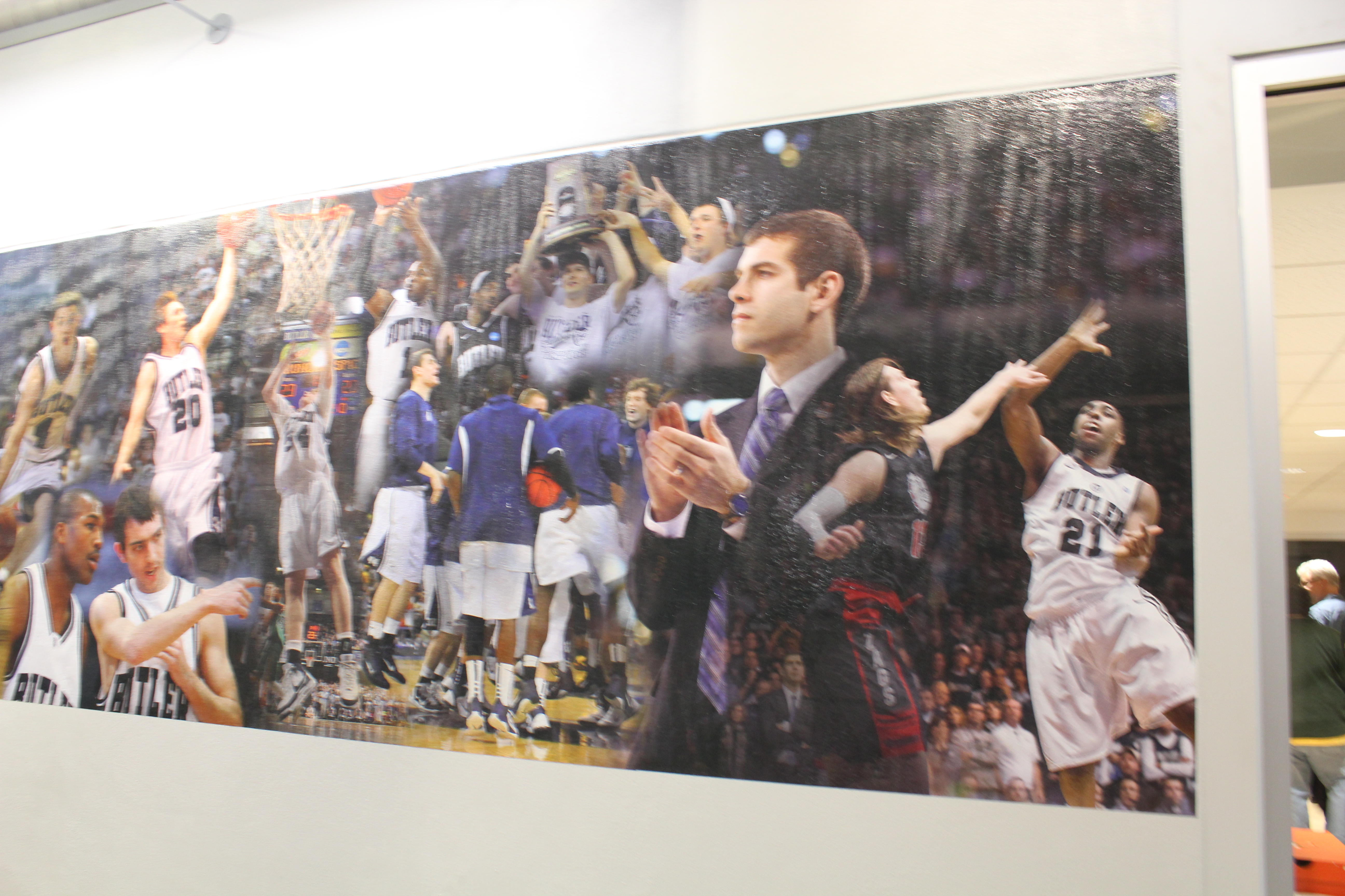 • Widened hallways surrounding the gym, also featuring murals of old Butler logos, and a progression of the men’s and women’s basketball teams through history