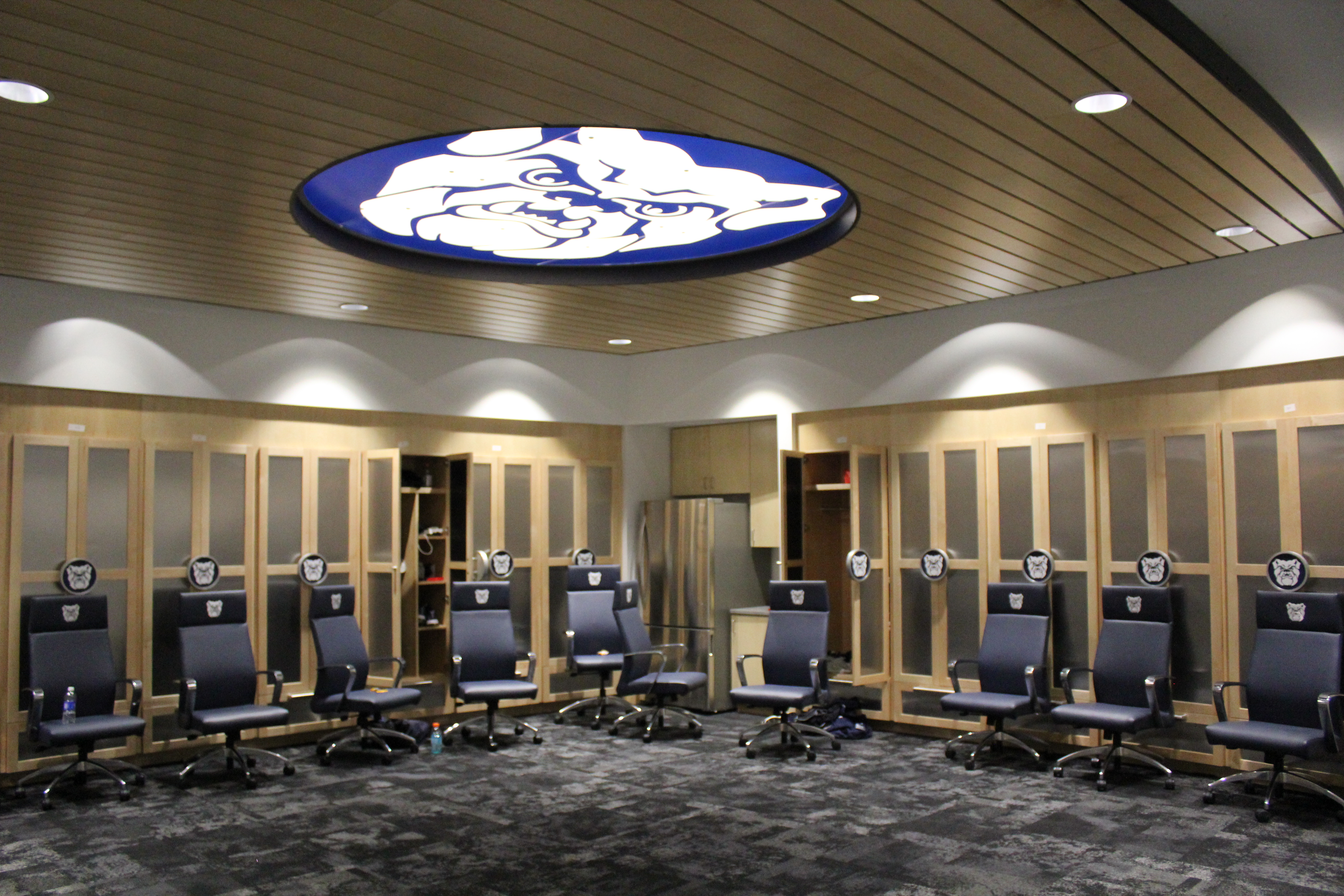 The men’s basketball locker room received a big-time improvement as well, now featuring a light-up Bulldog logo in the ceiling, new carpet, new lockers and a scoreboard clock to let the team know how long they’ve got until they need to be on the floor.
