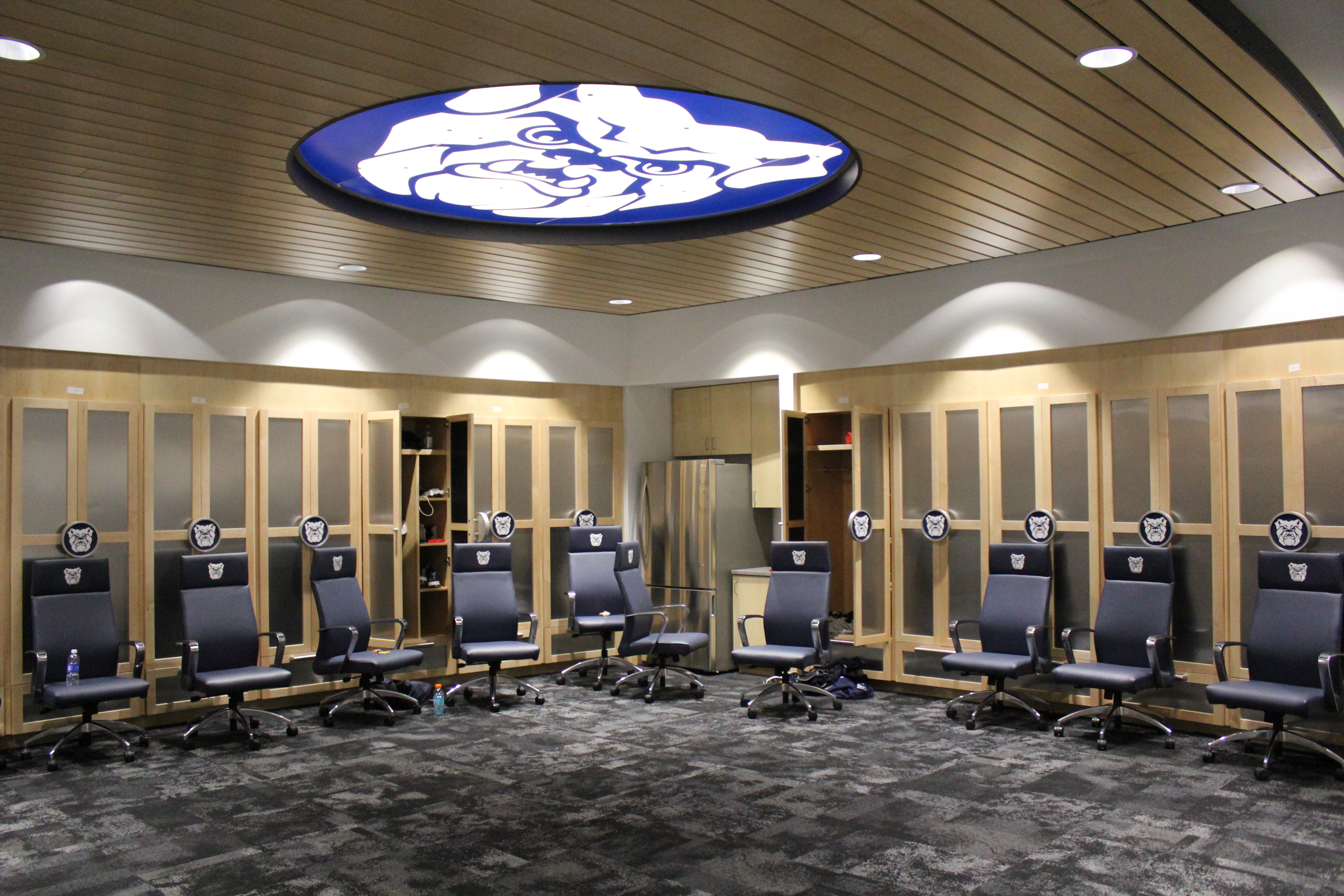 The men’s basketball locker room received a big-time improvement as well, now featuring a light-up Bulldog logo in the ceiling, new carpet, new lockers and a scoreboard clock to let the team know how long they’ve got until they need to be on the floor.
