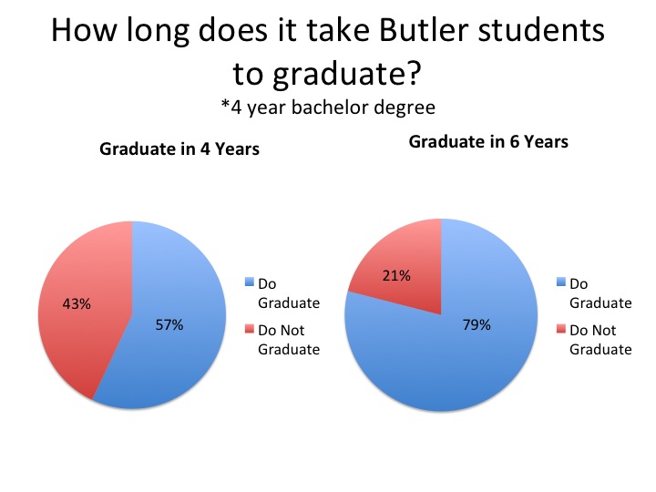 Forty-three percent of Butler students from the class of 2009 on a four-year track did not graduate in that time frame. Just under half of the nation’s students at private universities who plan to graduate in four years actually do this, according to the most recent data from the National Center for Education Statistics.