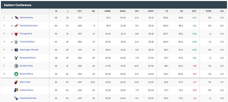 The final two seeds in the Eastern Conference could come down to the last day of the season, as just three games separate the seventh through 12th-placed teams.