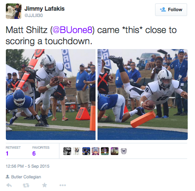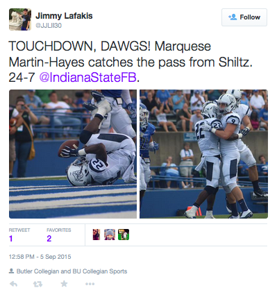 Indiana State controlled the entire first quarter, building up a 24-0 lead. An interception by sophomore defensive end Mark Geers in the second quarter turned the table for the Bulldogs. Butler quarterback Matt Shiltz just missed finding the end zone on a quarterback sneak early in the second quarter, but connected with senior wide receiver Marquese Martin-Hayes for a touchdown on the ensuing play to get Butler on the scoreboard.