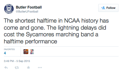 The Indiana State Sycamores didn’t lose much Saturday besides a halftime marching band performance. After five hours, two lightning delays and the shortest halftime in NCAA history, the Butler Bulldogs fell to the Sycamores 52-17.
