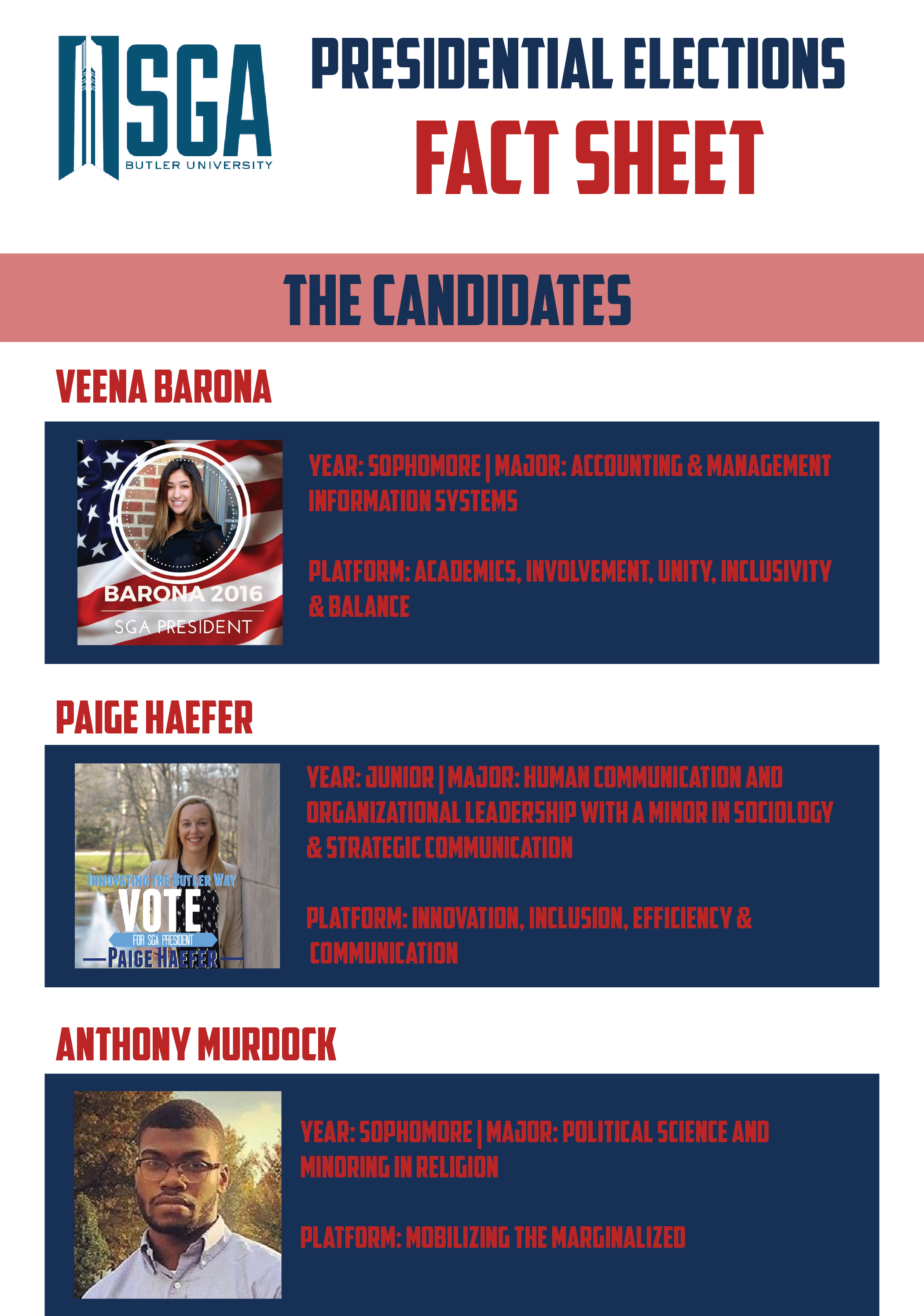 Veena Barona. Paige Haefer. Anthony Murdock. These three names are Butler SGA’s presidential candidates. The Butler Collegian tuned into their debate, held by the Student Government Association in the Pharmacy building Thursday, Feb 25 from 8 to 9 p.m..