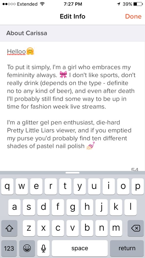 I decided to try something earlier this month after seeing an internet post that was making the rounds. It claimed that men treat women a lot differently on Tinder if their bios make them seem like the ultimate “girly girl.” Here is the faux-bio that I promptly wrote up: