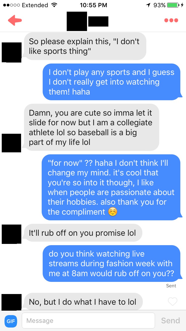 His typically masculine interest—baseball—was something I would just learn to like, but my typically feminine interest—fashion week—was something he knew he would never enjoy. In an interesting turn of events, this ended up being one of the most foreseeable conversations I experienced.
