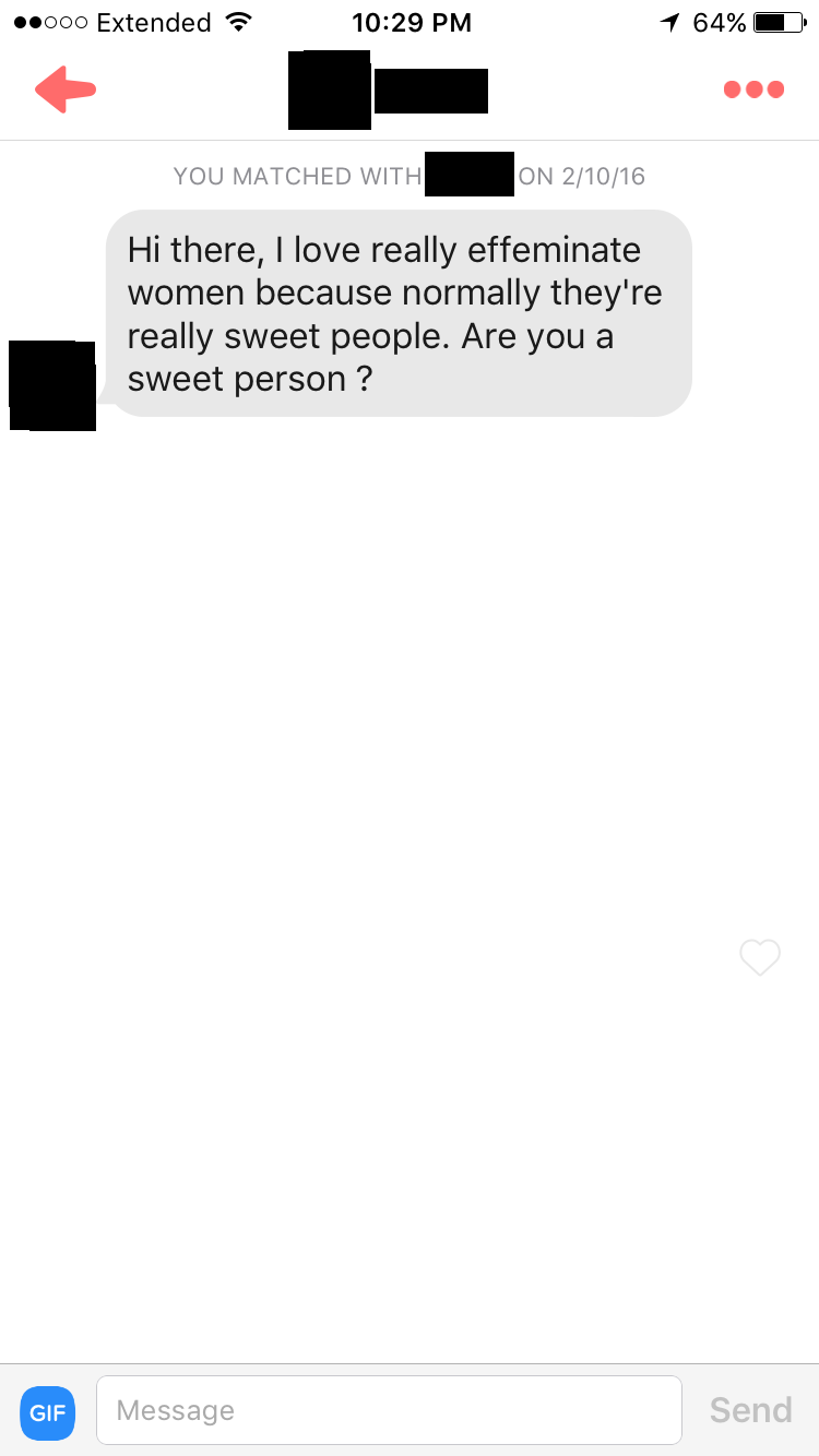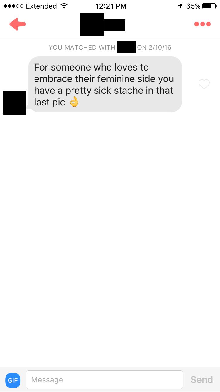 I learned a lot about Tinder that week. The biggest lesson was probably not to make generalizations about how certain groups of people use the app. While I received several really odd responses to my openly-feminine bio, there were several guys who didn’t seem to mind how different we were.