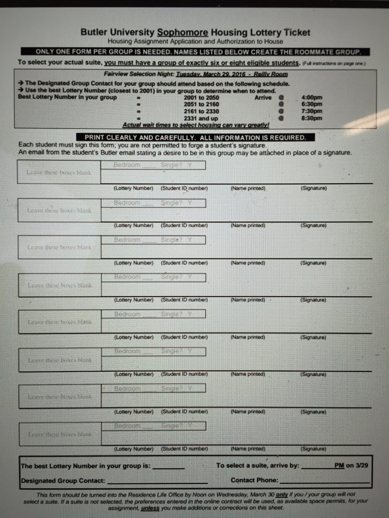 Howell said he wants students to understand that it is okay if they cannot find a full group, and that they shouldn’t give up completely just because they cannot find a group of six or eight. If one does not have a full group, he or she can still turn in an individual form or a form with just one roommate or a few suite-mates. The only difference is one cannot choose a specific suite unless he or she has a full group.