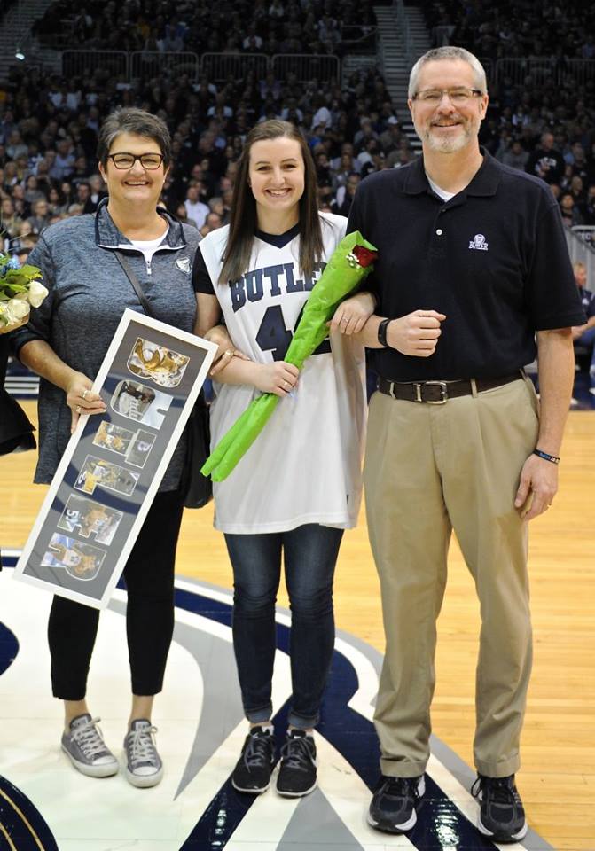 Senior Hannah Meinen stands with her mother and father during the men’s basketball senior day festivities on March 5. Photo courtesy of Hannah Meinen.