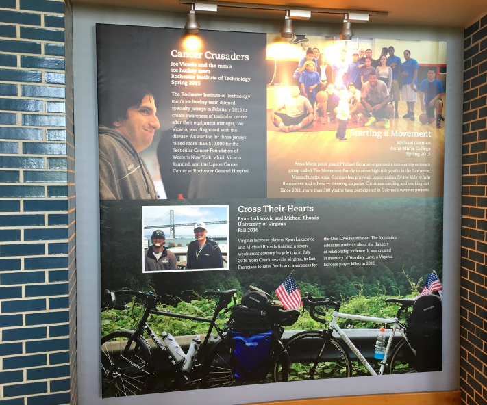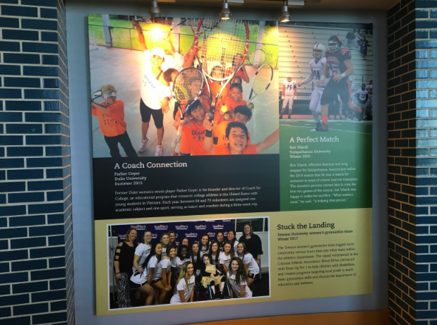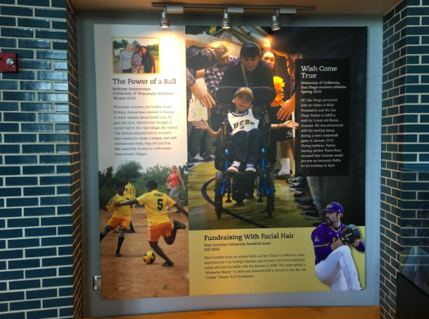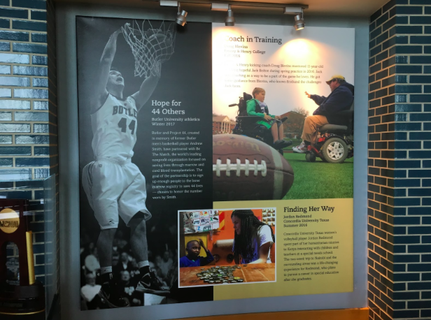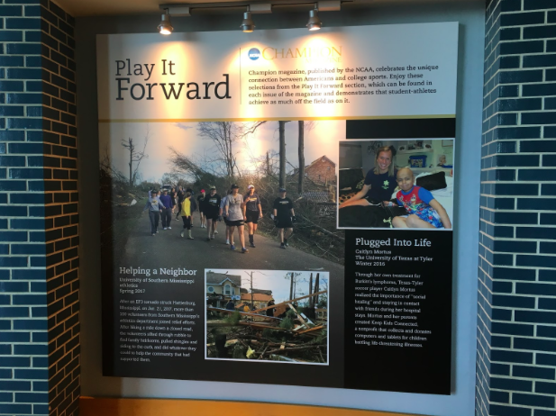 The exhibit on the second floor at the Hall of Champions is filled with bright colors and great pictures, but the heart of the exhibit showcases the time that student-athletes take to give back to their communities.