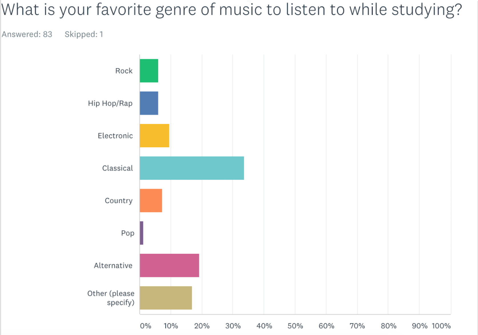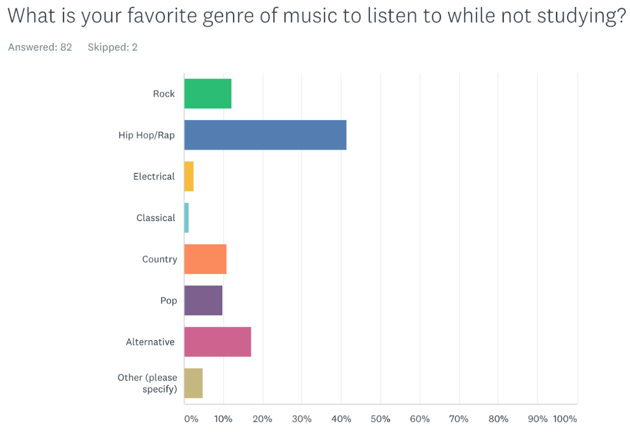 The last question in the survey was, “What is your favorite genre of music to listen to while not studying?”
