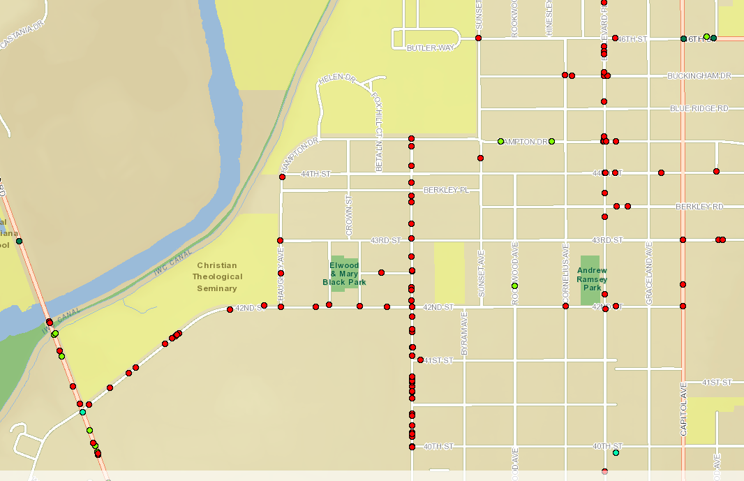 Several roads nearby Butler’s campus have dozens of potholes. Map from Indy Pothole Viewer.