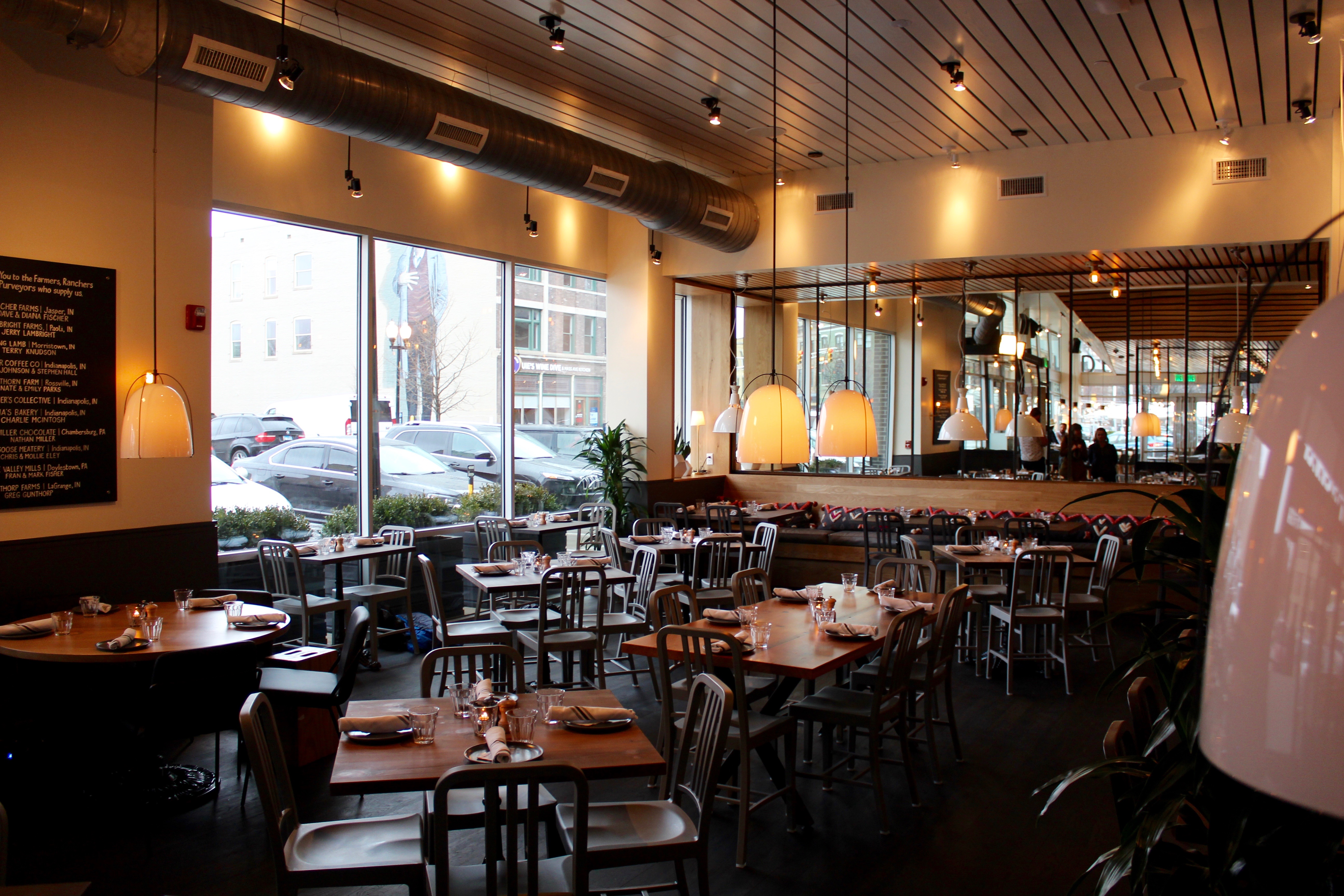 Hedge Row is described on its website as being a “relaxed American Bistro featuring rustic dishes from a wood-fired oven.” The space itself is simultaneously rustic and modern, featuring wooden tables paired with metal chairs and fixtures. There’s a long wooden bar, a visible kitchen with a wood-fired oven and a large sign listing the local Indiana farms in which the restaurant’s food is sourced.