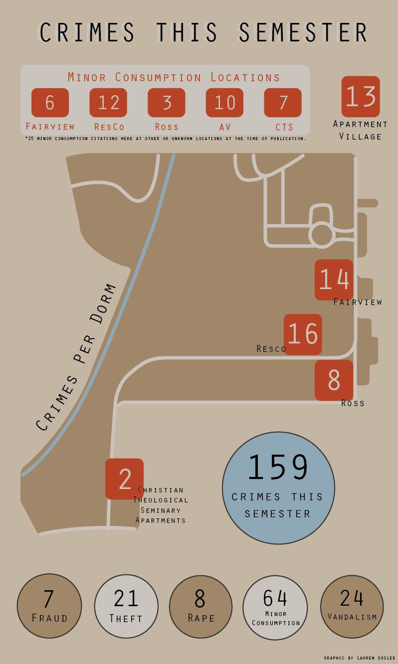 Over the course of the semester, 159 instances of crime were reported to the Butler University police department, including minor consumption, rape, fraud, theft and vandalism.