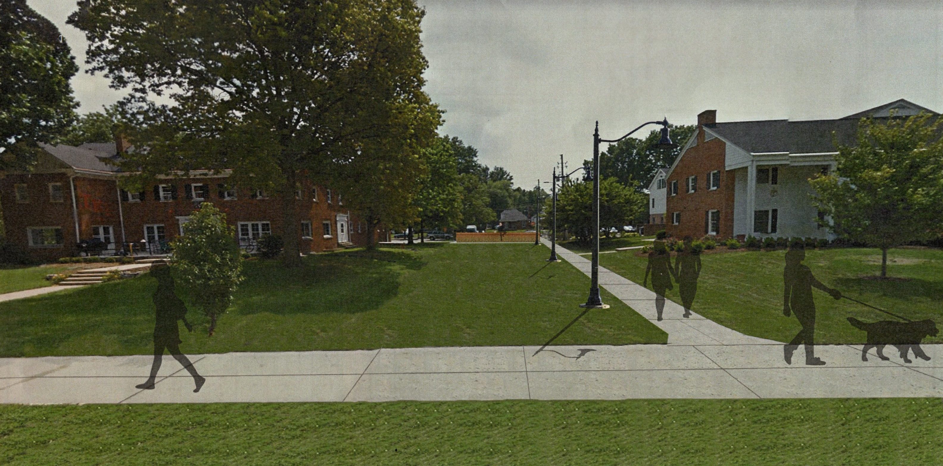 The original proposal for a redesigned Beta Lane, which is currently a road between Alpha Chi Omega (right) and the abandoned TKE house (left). Photos obtained by the Collegian.