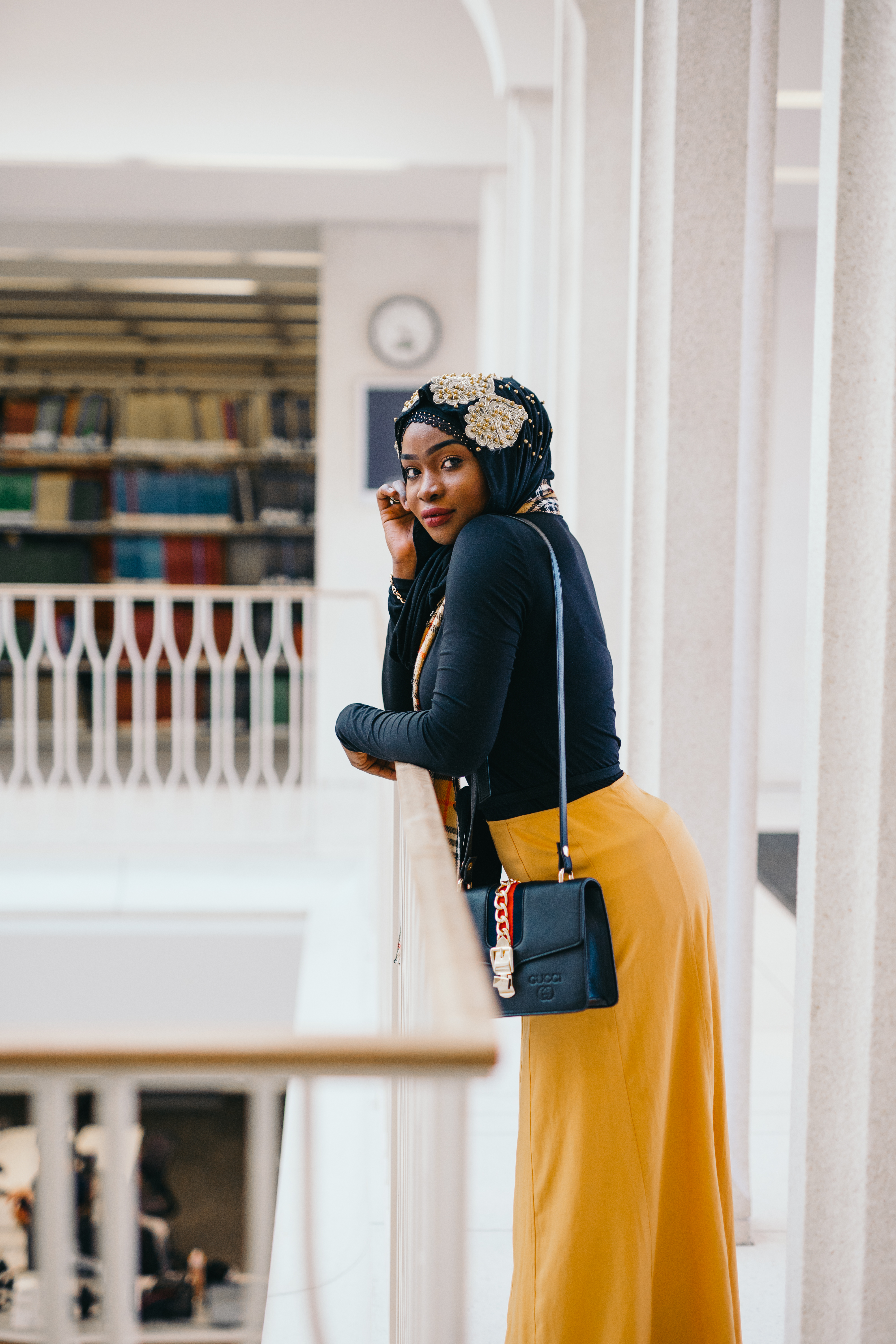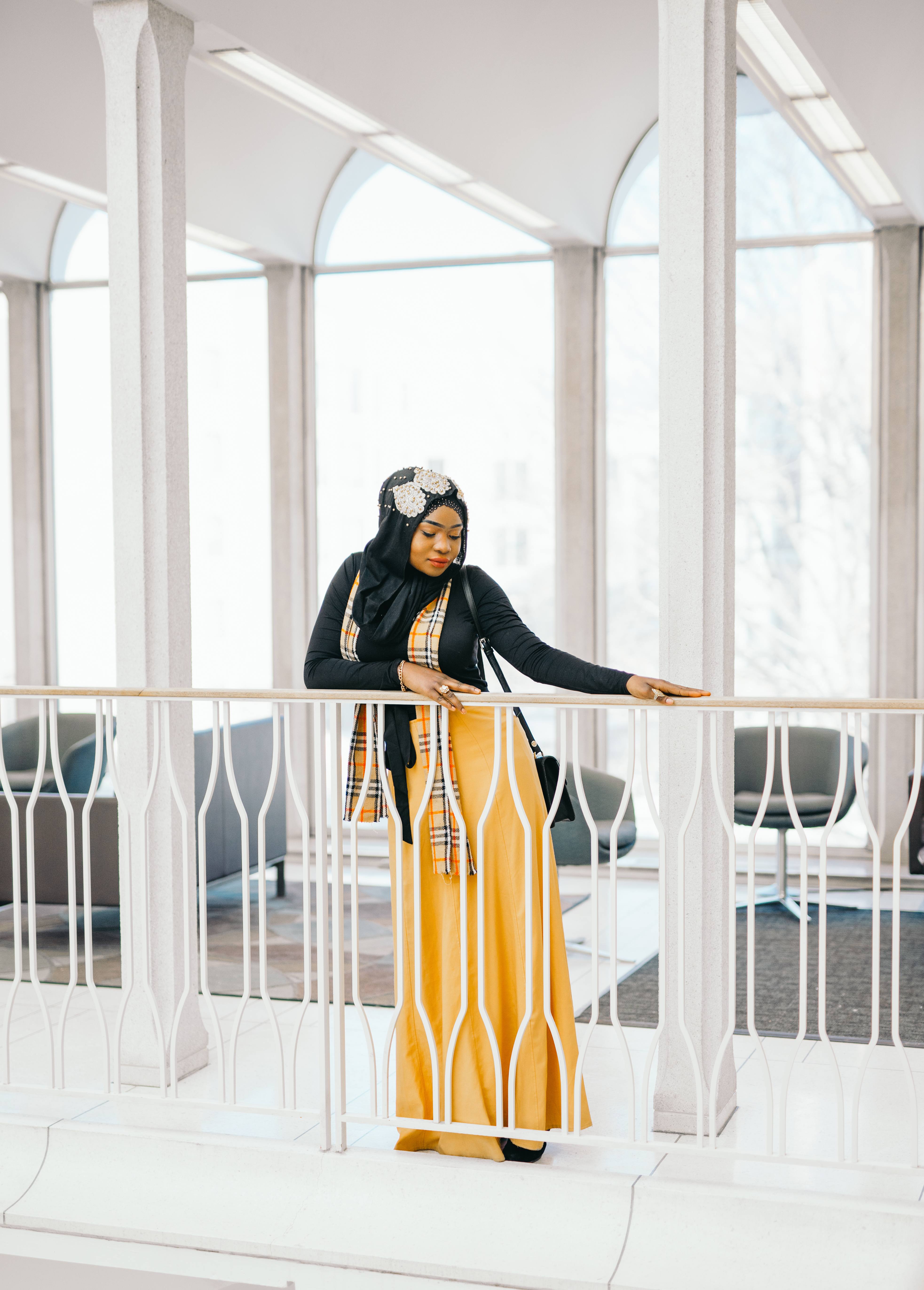 NI: As the only black Muslim hijabi here, I stand out already in comparison to my peers. Since people already look at me since I wear a hijab, long dresses and skirts, I use that attention to fuel my passion for fashion. If someone on campus looks at me because I stand out, I make it worth their while and end up being remembered for my style instead.