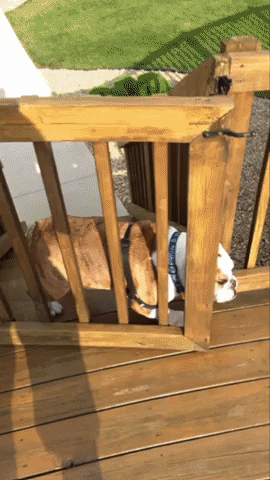 The Kaltenmark family was spending the afternoon at the swimming pool as a sad-faced Trip watched from the window, unable to join the fun. The next thing they knew, Trip was barrelling through the outdoor gate towards the water.