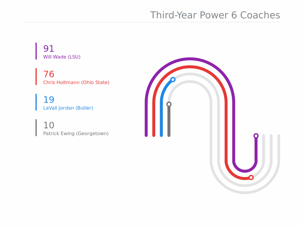 Immediately evident is the fact that the coaches at the top were put in a better situation to succeed than the teams at the bottom. Wade had two very successful years at VCU before taking the reins for LSU. Holtmann had built a strong recruiting reputation at Butler before taking all those connections to Ohio State.