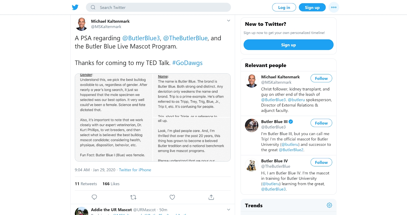This fact was made evident in a tweet posted by Michael Kaltenmark, live mascot program handler and director of external relations, last week. Framed as his “Ted Talk,” Kaltenmark explained his view on the issues of gender and name for Blue IV, as well as the general role of Butler Blue for the university.