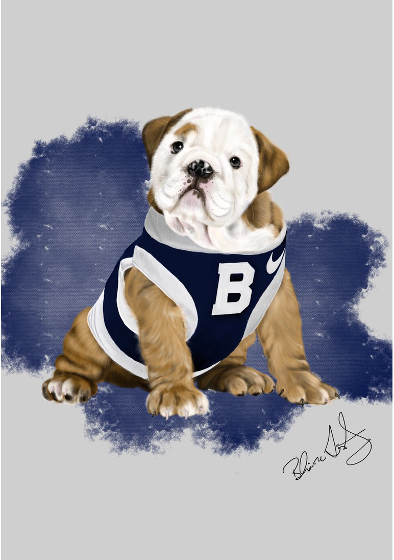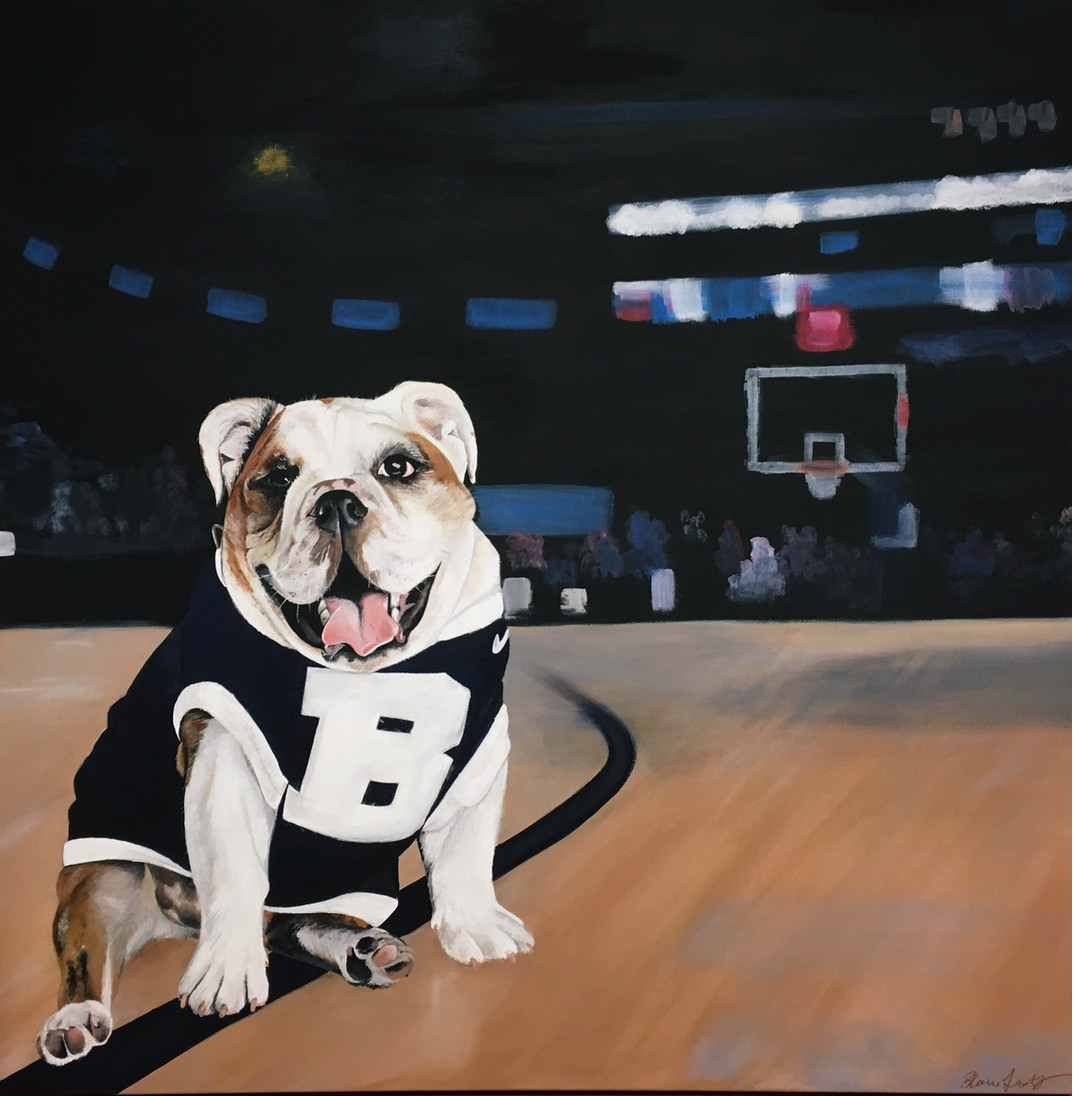 It’s safe to say that both bulldogs are preeminent figures on campus. When the dogs aren’t greeting prospective students or cheering on current students, their slobbery, wrinkled faces constantly gaze at students from hats, stickers, photos and shirts. For Trusty, they gaze through her artwork.