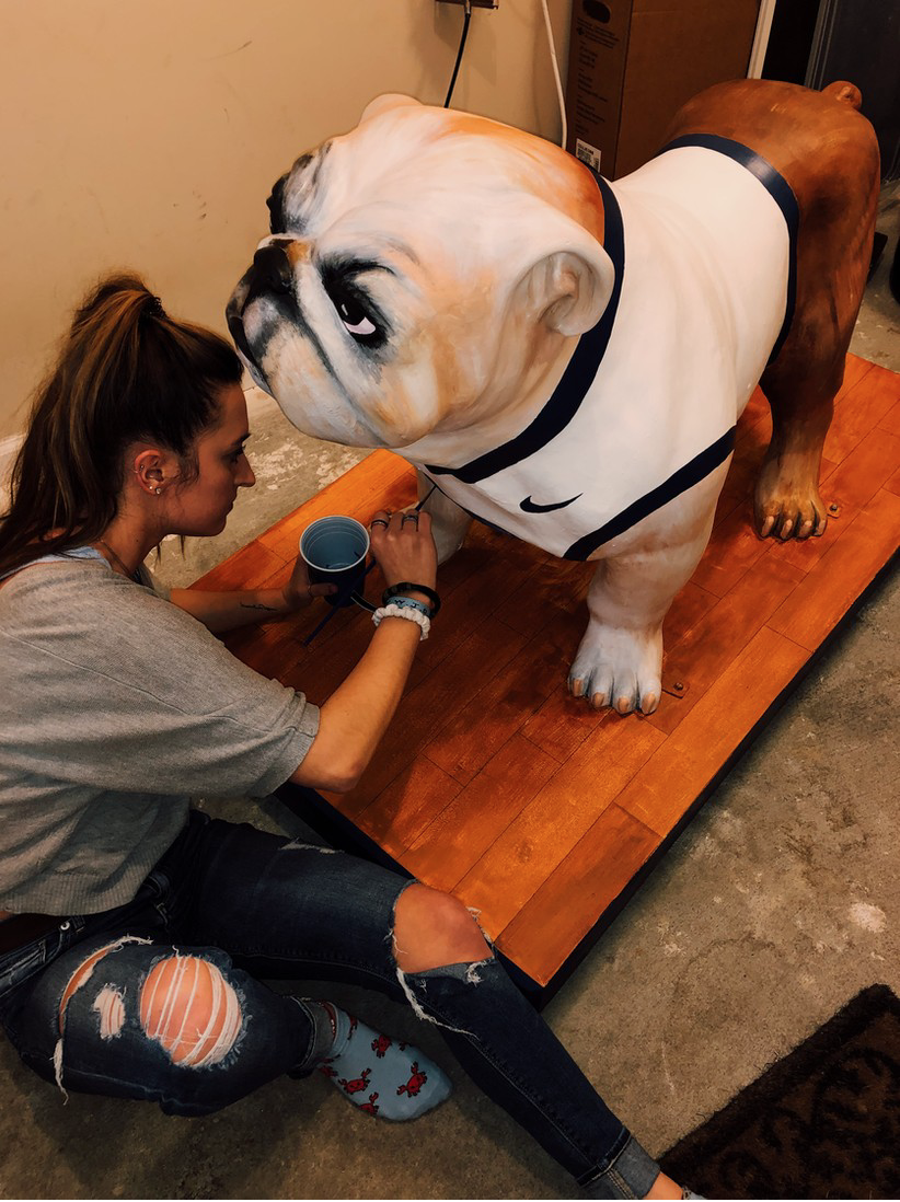 “They had a really old [bulldog statue] that I think students painted about five years ago,” Trusty said. “It was sitting in the basement of Jordan for forever. Once they saw my mini statue and the painting, Mark connected with a lot of higher-up people in the university. That’s how they got ahold of me to do the bigger [statue] that’s in Jordan right now.”