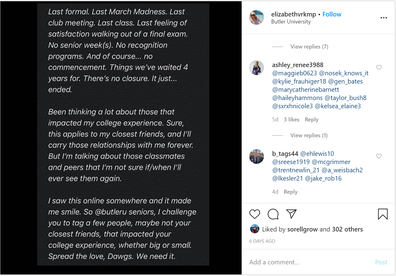 On March 17, Butler University President James Danko announced classes would be online for the rest of the semester and spring commencement was canceled. Butler seniors took to social media to react to not having a traditional graduation ceremony at the end of the semester.