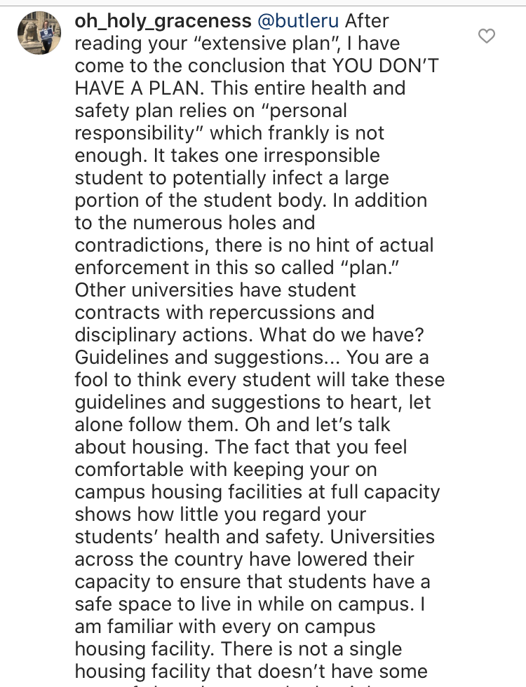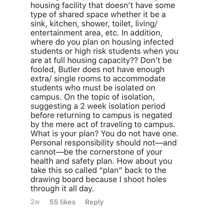 When Higgerson read the Health and Safety Plan, she said she was “dumbfounded” that a university would be so vague in its reopening plans. After publicly commenting on the Butler Instagram post about the plan, Higgerson received multiple messages from her friends and from students she didn’t know echoing her concerns.