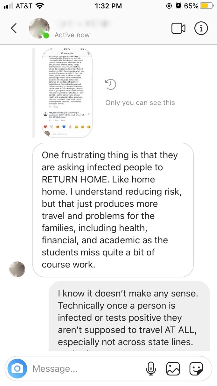 Rather than utilizing the dialogic function of social media to address the concerns of students and parents, Butler Marketing and Communications department merely glossed over their apprehensions by referring them back to the Student Health and Safety Plan website. When Higgerson contributed a paragraph’s worth of discontent over enforcement of the new protocols, murkiness around the involvement of SDS in the fully remote option, and the toxicity of The Butler Way, MarComm cut her short.