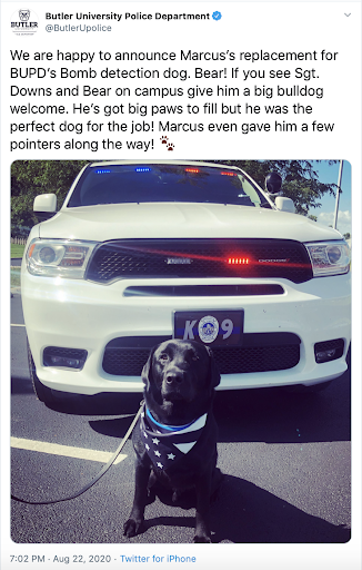 While the administration delayed meeting student demands, the Butler University Police Department decided to post this photo of Bear, the bomb-sniffing dog — in a Blue Lives Matter bandana. BUPD should be utterly ashamed of themselves for ever thinking this was appropriate to post — especially now. If that tweet alone is not enough to show that there is serious opposition to the Black Lives Matter movement and racial justice in general at Butler, then I honestly do not know what is.