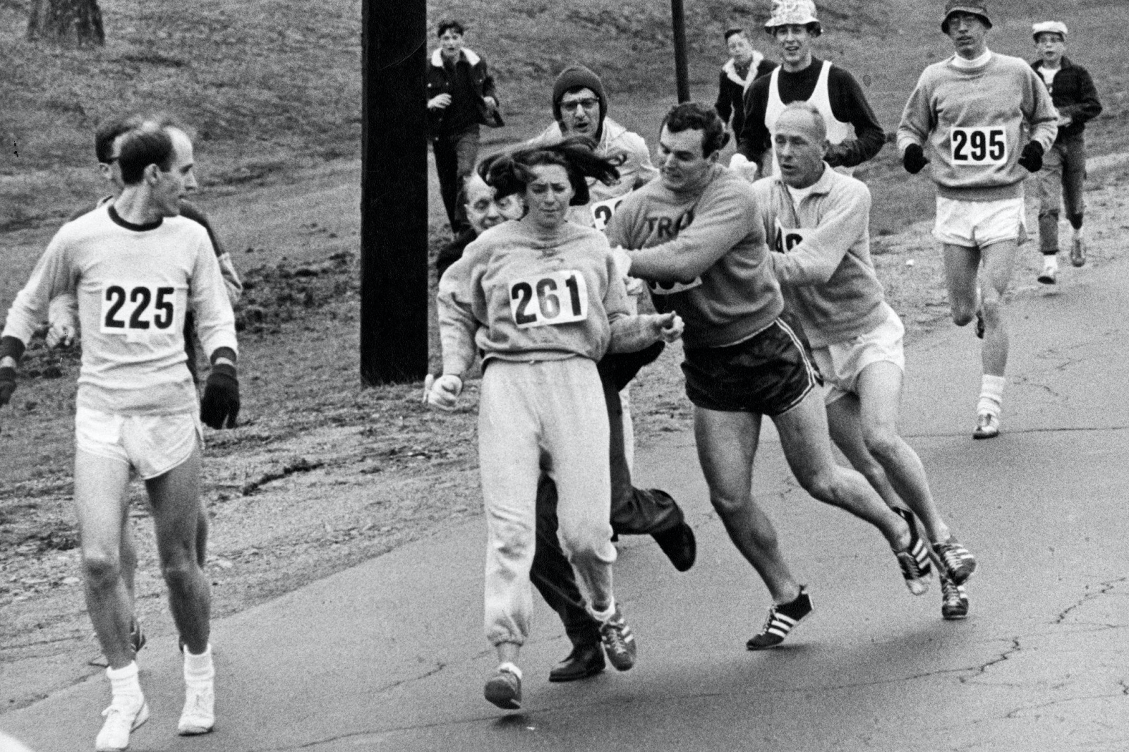 The previous year, in 1967, women weren’t allowed to participate in the Boston Marathon, so Kathrine Switzer entered as K.V. Switzer to conceal her gender. Two miles in, an official tried to physically remove her from the course, pulling at her arms and clothing. She finished anyway, becoming the first woman to officially complete the race.