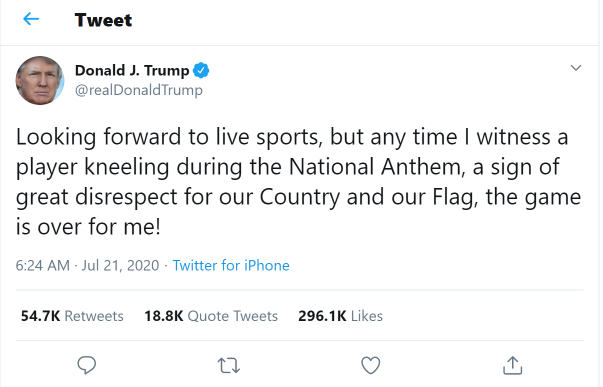 We’ve seen heavily armed citizens enter state capitols and scream in the faces of capitol-building police, only to turn a blind eye to police brutalizing protesters and killing Black Americans or less than a month later. And now that athletes are using their voices, protesting peacefully as many of these same people have suggested activists against racial injustice ought to do, they once again decide to engage in some kind of confused social commentary they call “activism.”