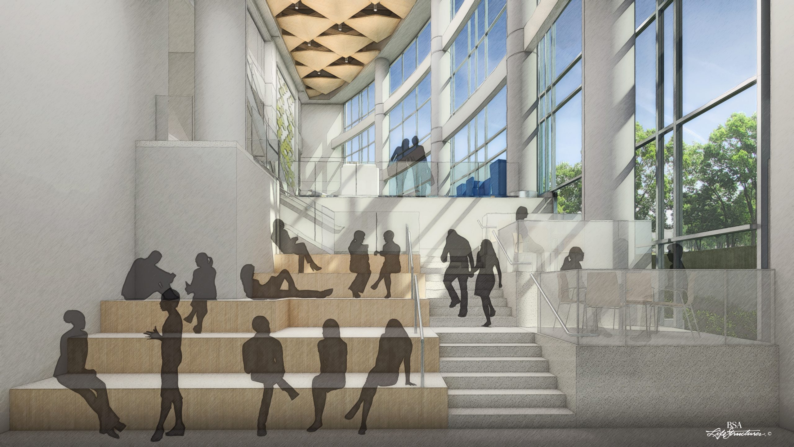 Furniture for the atrium, which is currently being finalized, will include several small tables and chairs for gathering, as well as larger couches and individual chairs by the windows. Toward the west end, the atrium will also feature risers for students to gather on, as part of the Fenneman Gateway donor space.