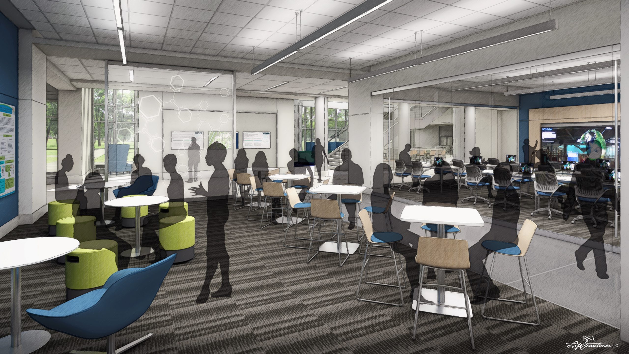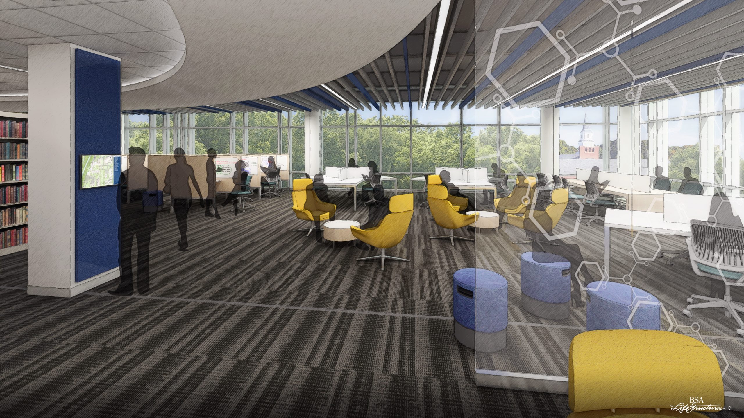 The renovated science library will feature study spaces for groups and individuals. Rendering courtesy of Butler University Office of Advancement.
