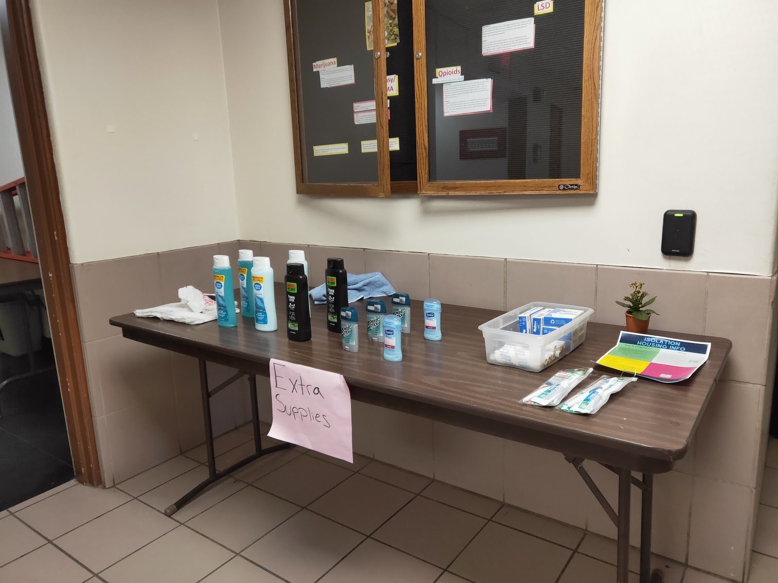 I entered Ross using my student ID and picked up my room key and a drawstring bag from the lobby. The bag included flip-flops for the communal shower, alcohol wipes, tissues, hand sanitizer, masks and trash bags. There were also extra emergency toiletries such as toothpaste, deodorant, menstrual products and shampoo set out on a table in the lobby. However, you must bring your own toiletries, bedding and towels.