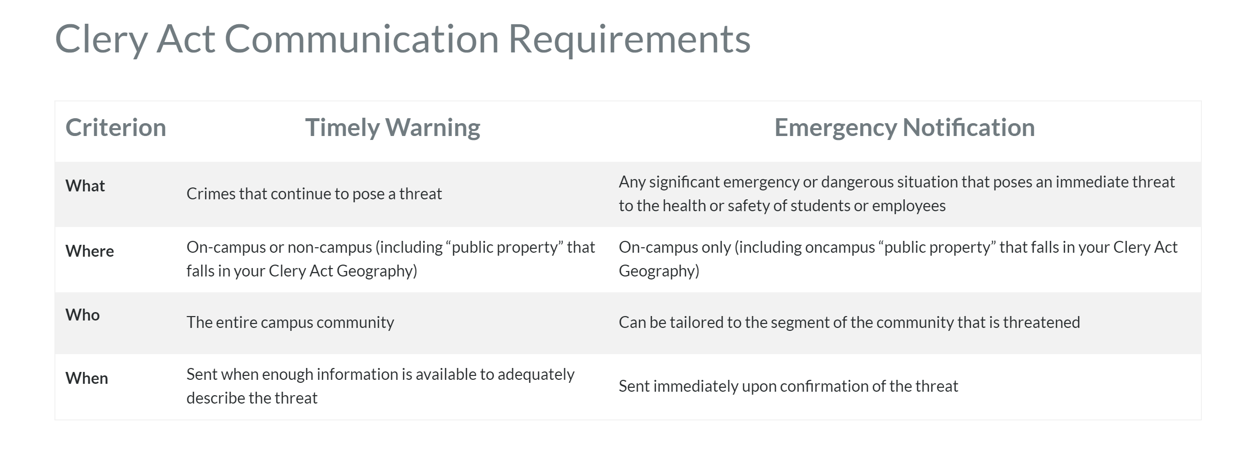 The table describes the criterion of timely warnings and emergency notifications under the Clery Act. Image courtesy of Everbridge.