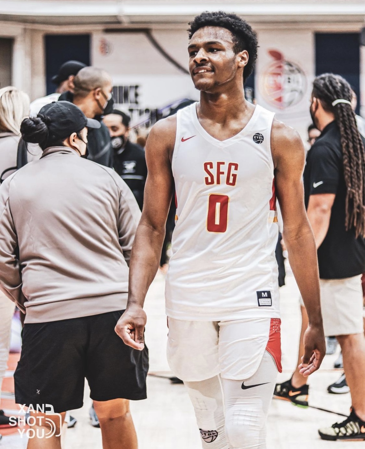 Bronny James walks off the court postgame at the Nike Peach Jam basketball camp on July 23. Photo by Xan Korman.