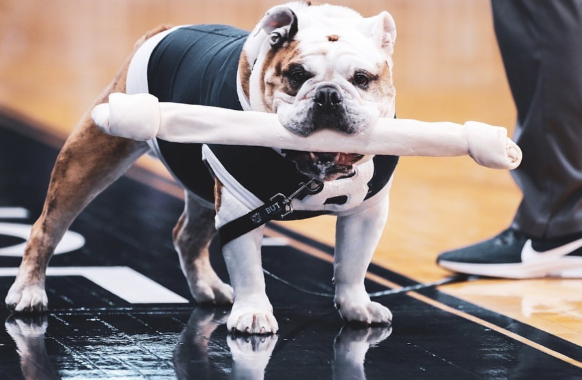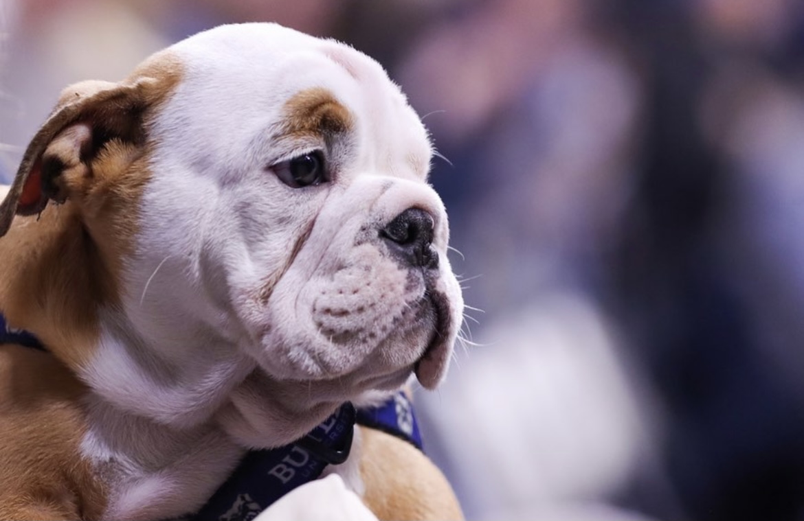 Butler Blue III proudly stands displaying his bone following his men’s basketball pre-game ritual at Hinkle Fieldhouse on Nov. 11, 2019. Photo by Xan Korman.