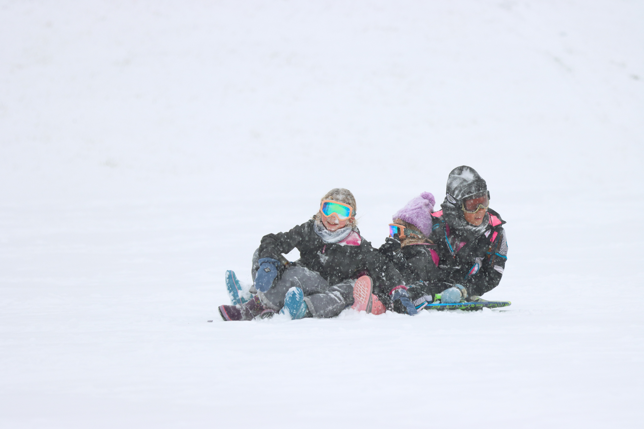 Flying down the hill on makeshift sleds meant falls and tumbles were frequent. The soft snow combined with the many layers of clothing helped cushion the inevitable wipeout at the bottom of the hill. Photo by Francie Wilson.