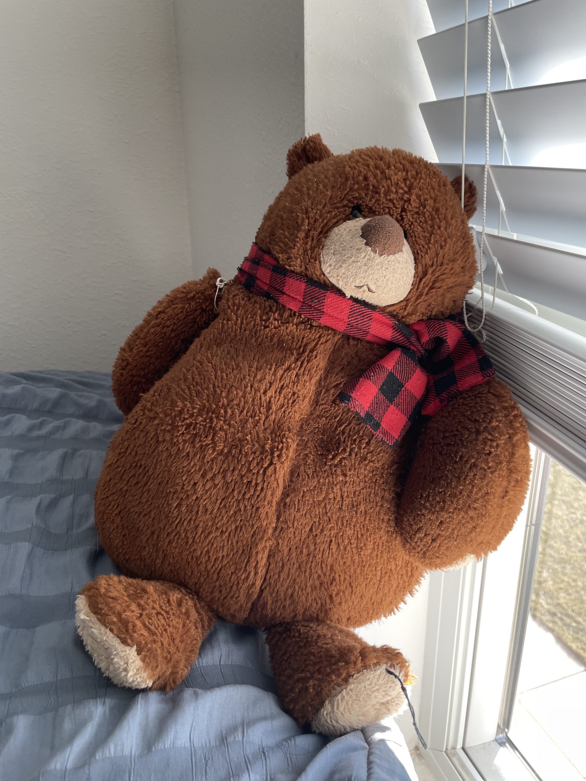 I received Cuddlebear about four years ago. He is quite obviously a Christmas bear,  accessorized with a red and black plaid scarf. Cuddlebear is chunky and huggable and has holes on his paw and in his armpit. He is the perfect cuddling size — hence his name — and while I usually neglect him throughout the day, I can’t fall asleep without holding him.