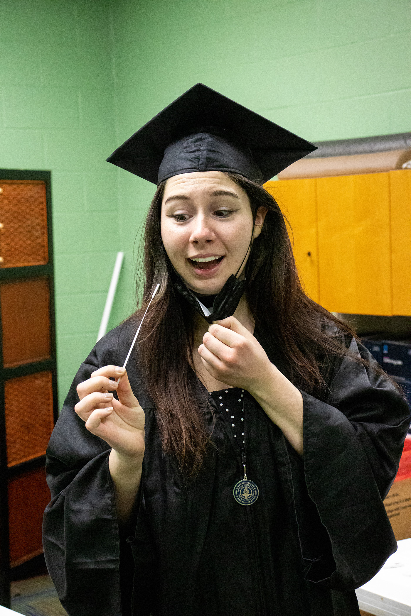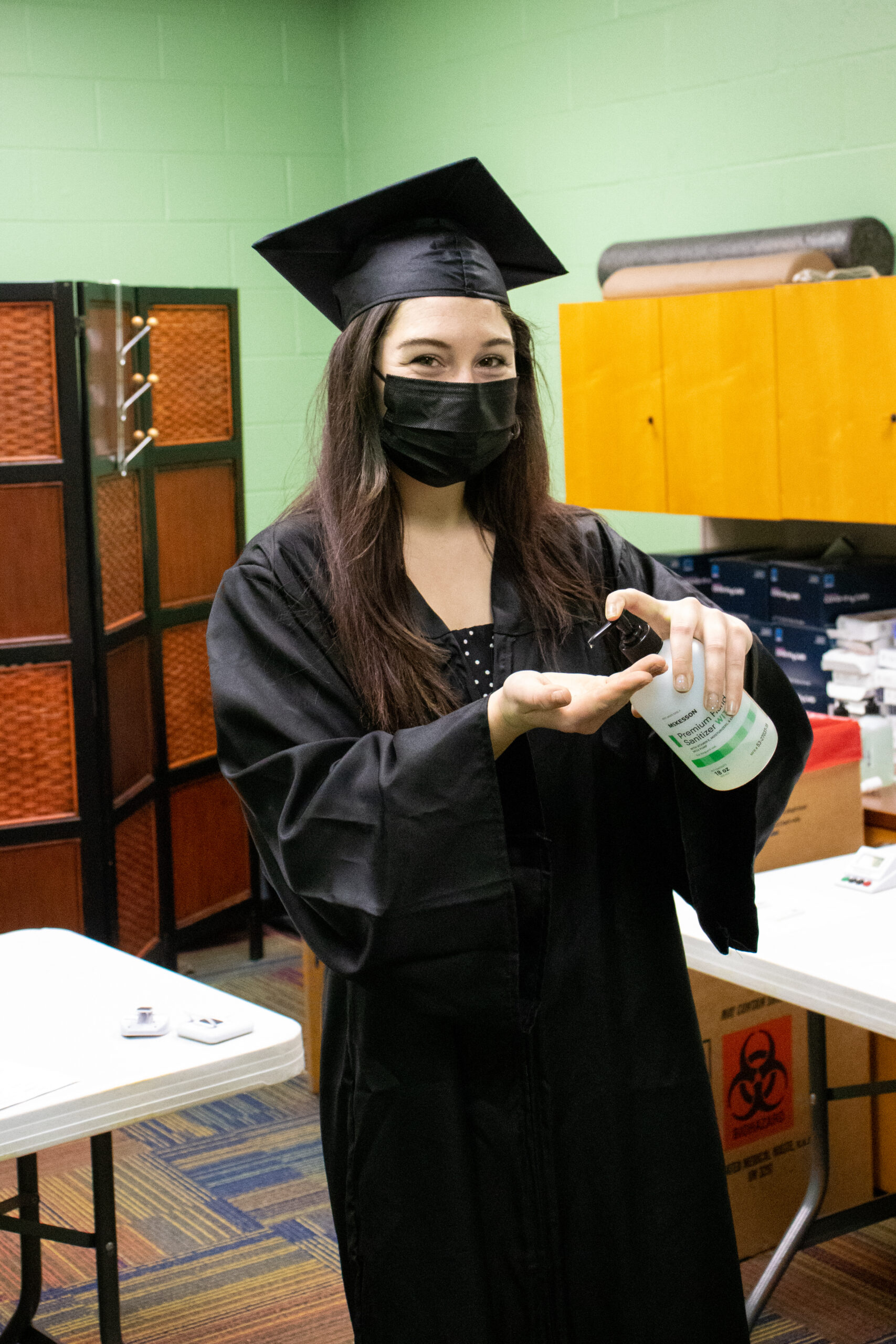 Forever recall the silly little swab that determined your on-campus eligibility for two years with a grad pic in the COVID-19 testing center. Make sure to sanitize your hands first, though. Photo by Ben Caylor.