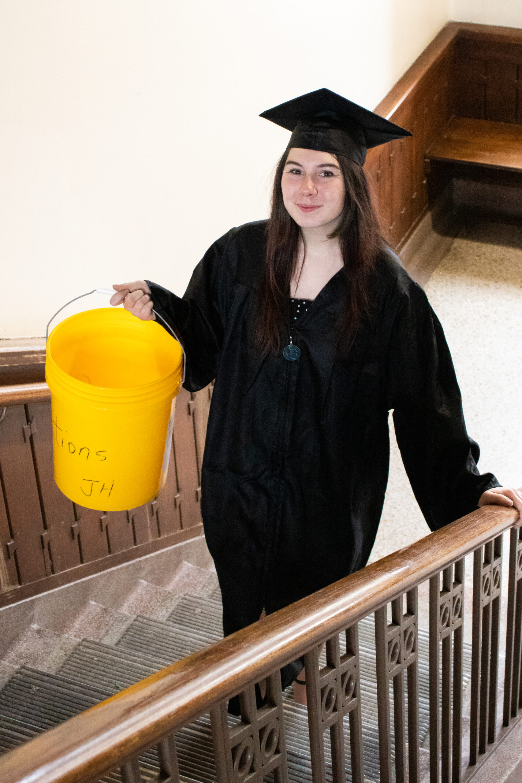 The yellow bucket in Jordan Hall adds the perfect pop of color to the dreary backdrop of the Jordan Hall stairs. Photos by Ben Caylor.