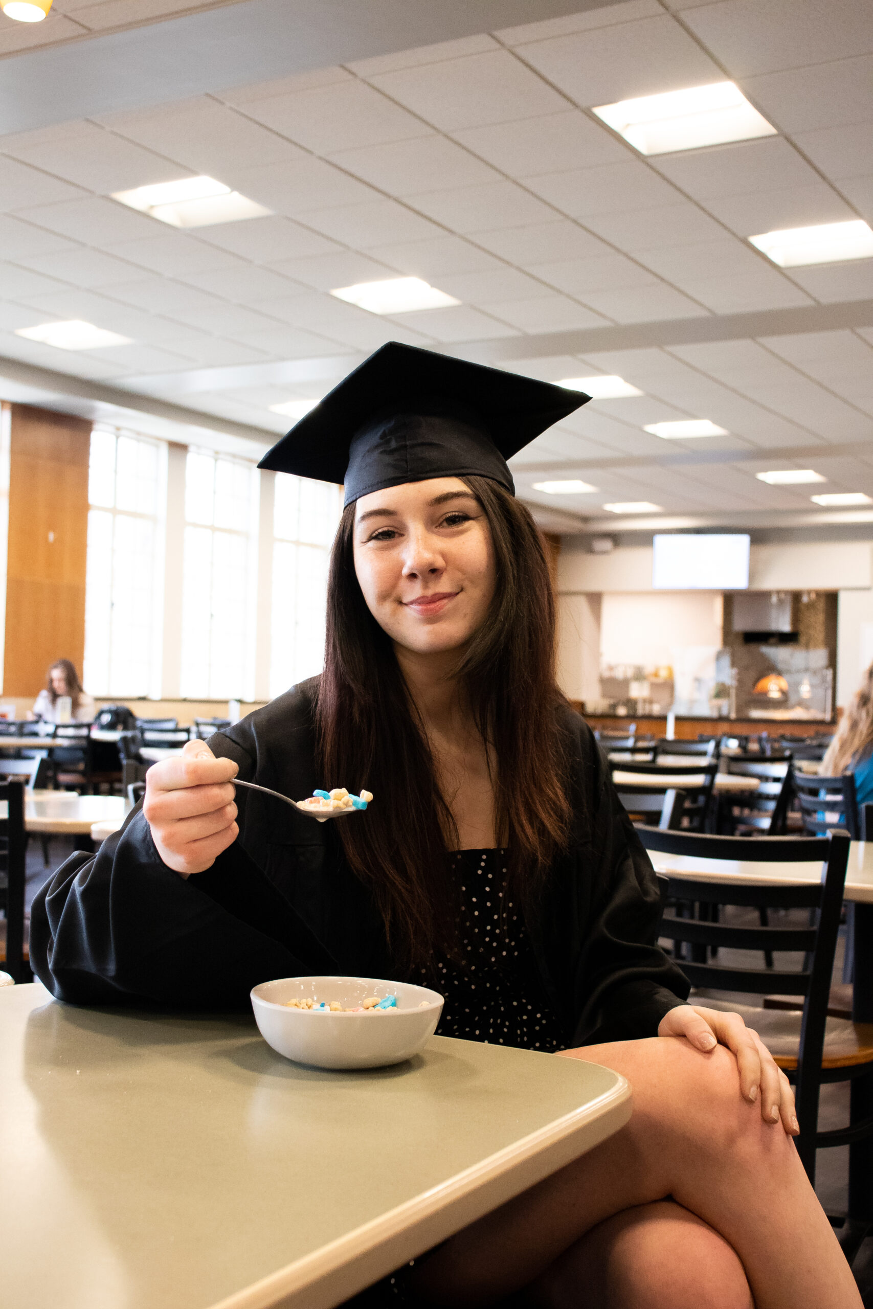 Freeman enjoys a bowl of Lucky Charms while also enjoying being mostly done with her degree. Photo by Ben Caylor.
