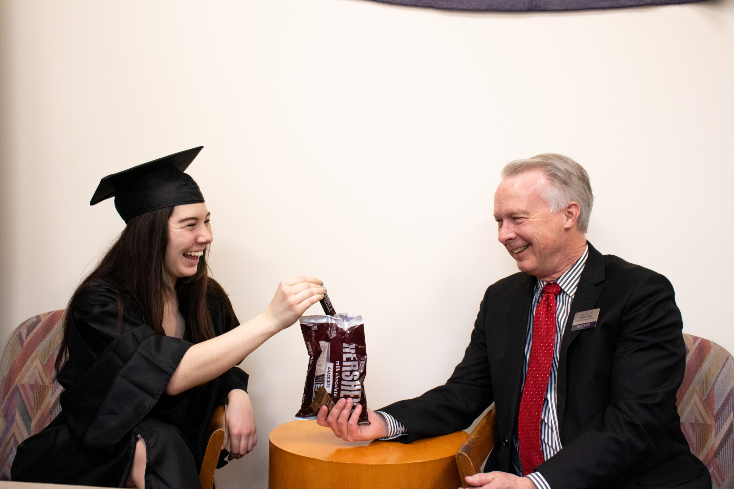 A Hershey’s bar, which is graciously provided by Freeman’s advisor Scott Bridge, makes for both a delectable midday snack and a tasty commencement treat. Photo by Ben Caylor.