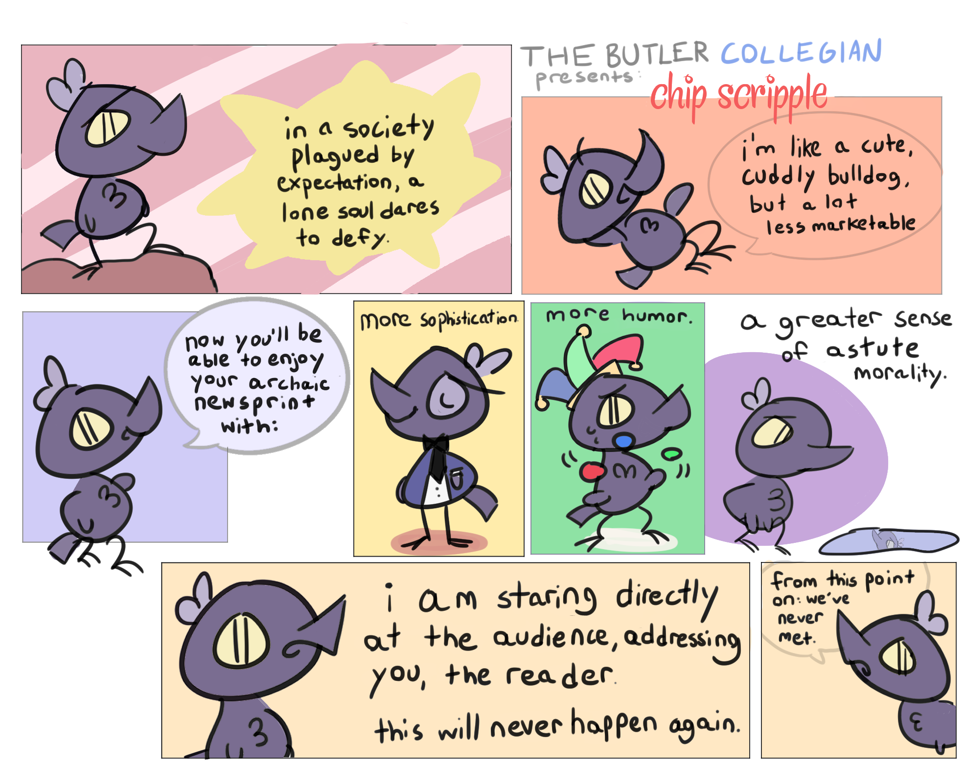 Hello! My name is Tim Eterno, and I am the well-intentioned creator of Chip Scripple, a new comic strip that I have recently started illustrating for the Collegian. The newspaper comic is one of the most universal forms of storytelling; it has the opportunity to reach an audience of millions of people from a multitude of cultures. Comic strips tell stories and introduce us to characters that endear us while painting reflections of our own society. From “Peanuts,” to “Pogo,” to “Calvin and Hobbes,” they unite us through a distinct visual medium that’s unlike any other form of media. I believe there will always be a place for a good comic strip, as long as an audience is there to look, laugh and listen.