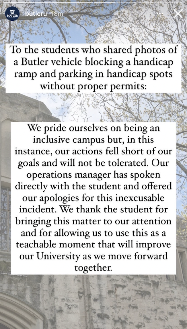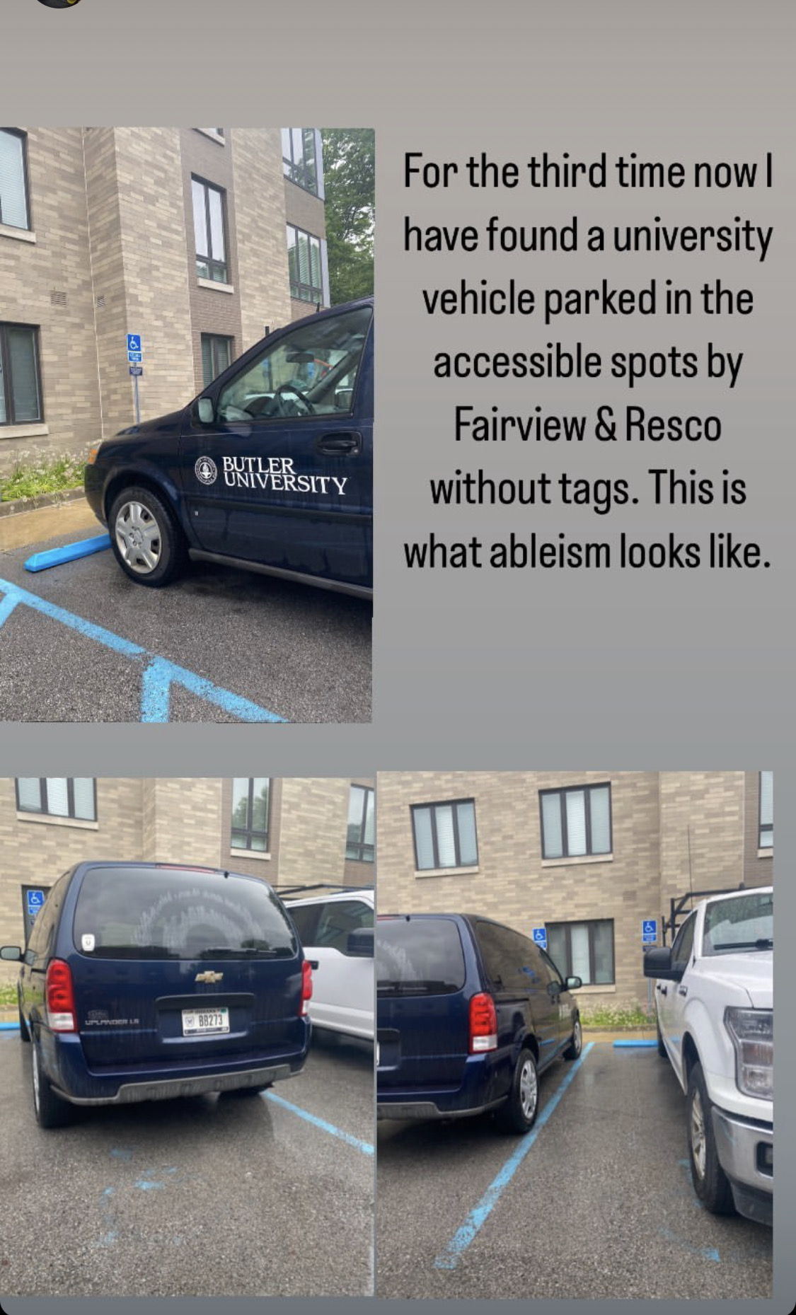 McElroy was, and generally has since been, very impressed with Butler’s accessibility within those criteria. However, recent instances of university vehicles parking in accessible parking spots and on ramps have sparked a conversation about how much Butler truly cares about its students with disabilities.