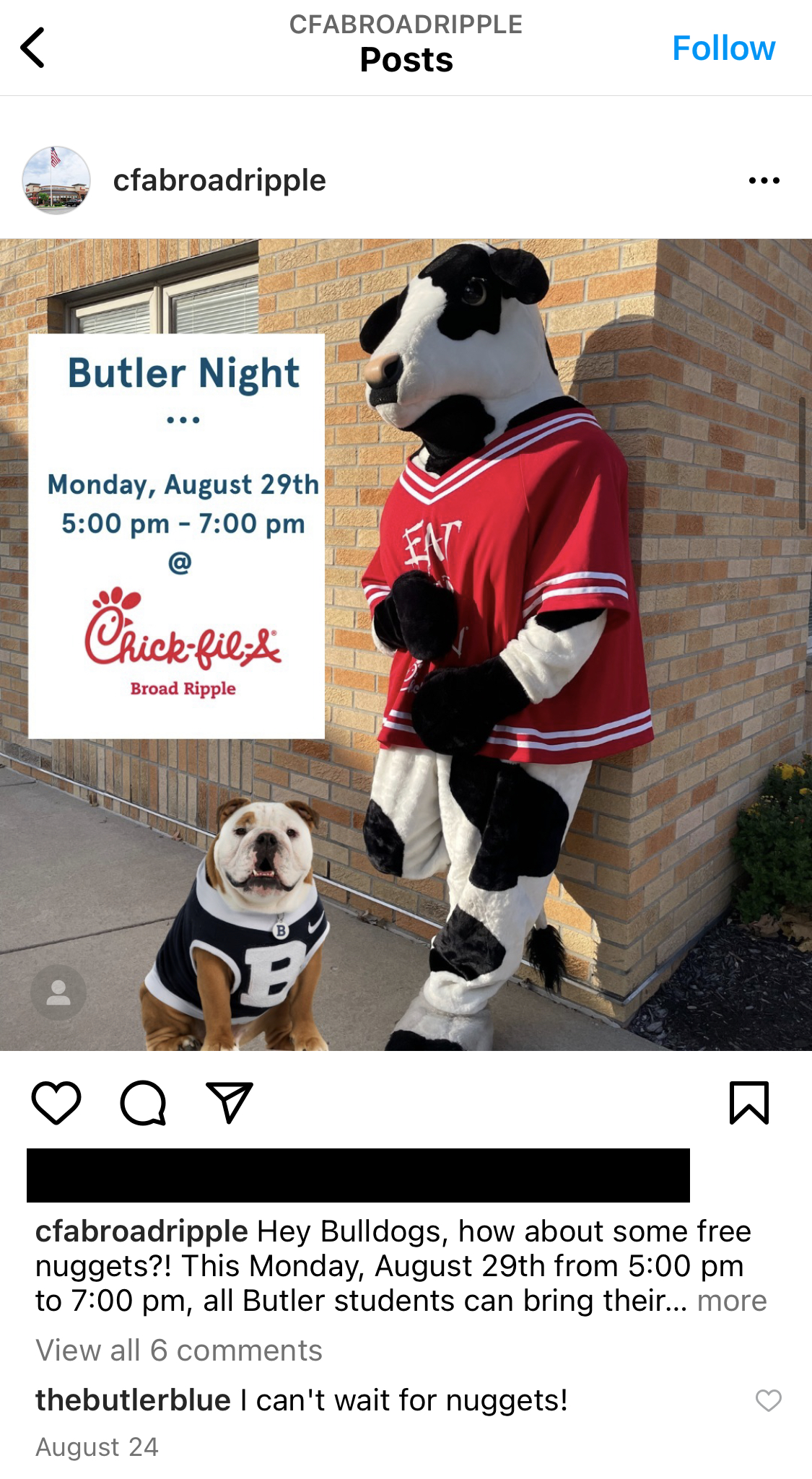 Athletic events aren’t even the only time that Butler works with Chick-fil-A. On Aug. 29, the Chick-fil-A in Broad Ripple invited Butler students to swing by for free chicken nuggets with a special guest: Butler Blue IV.