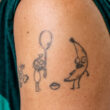 TV: My first tattoo is on my left shoulder. It’s a scene from a YouTube viral video — before YouTube viral videos — called Rejected by Don Hertzfeldt. It was for the Learning Channel. It’s the funniest nonsense. It’s a banana with eyes, and then there’s a little stick figure with a spoon, and there’s a bowl in the middle, and the spoon is super huge. The guy with the spoon just keeps saying, “My spoon is too big.”
