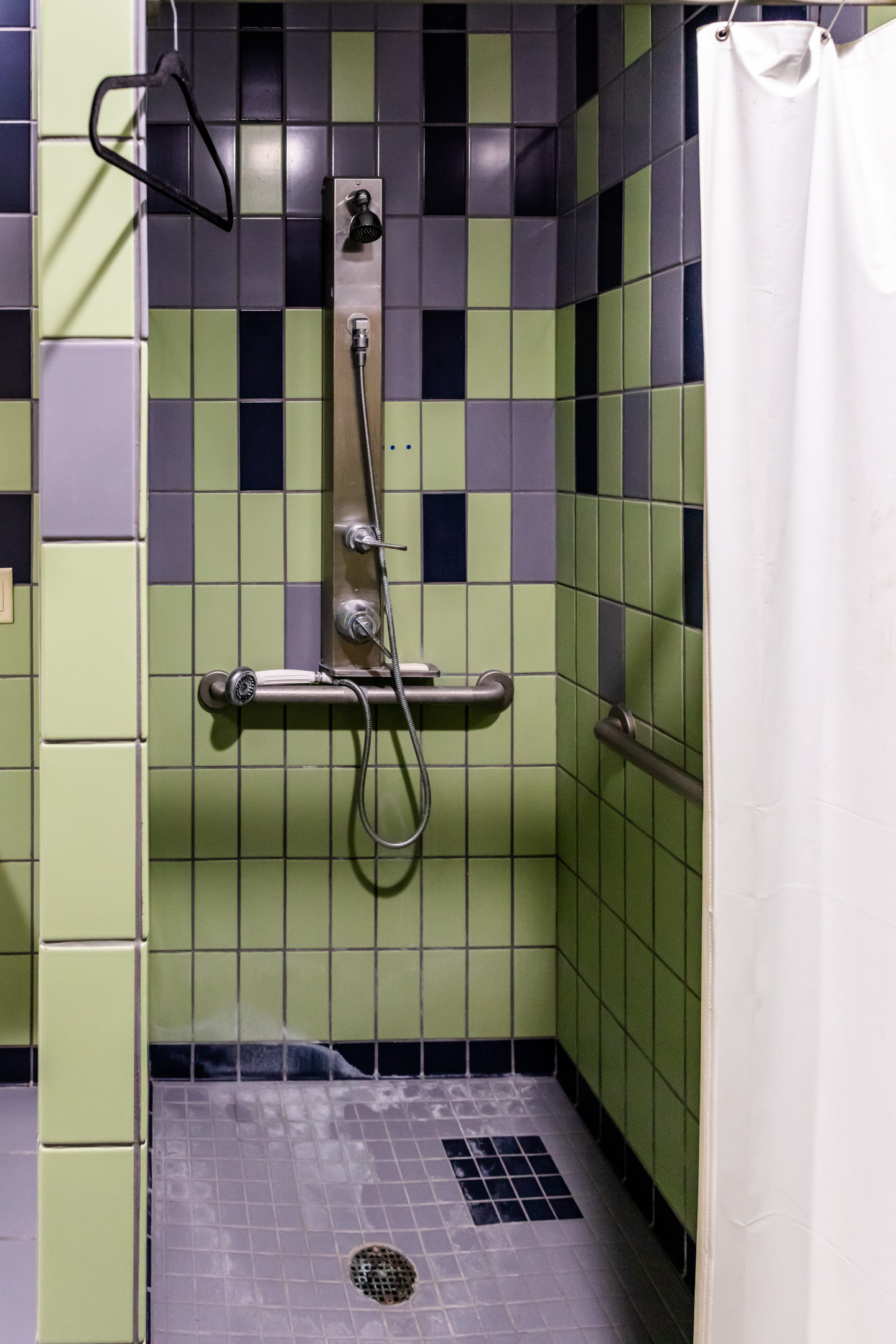 Let’s start with the tile: it’s green. I love green, it’s my favorite color, but this green was not doing it for me. The tiles are a watered-down dirty mint instead of the nice forest green we all love. Because the color of this tile is so putrid, it gets a four. As gross as the tile is, the shower is not particularly difficult to find. It lives in a bathroom in the COPHS basement, similar to the Dugan Hall showers, but is not labeled as clearly as the Dugan showers are, so it received a score of eight. The cleanliness is a four. It was not amazing, but it was not the grossest shower I saw on my shower tour. As with the Dugan shower, it was covered in calcium, and the shower curtain had a few mysterious brown stains. Also, there was a half-used bar of soap. That just does not scream clean to me.