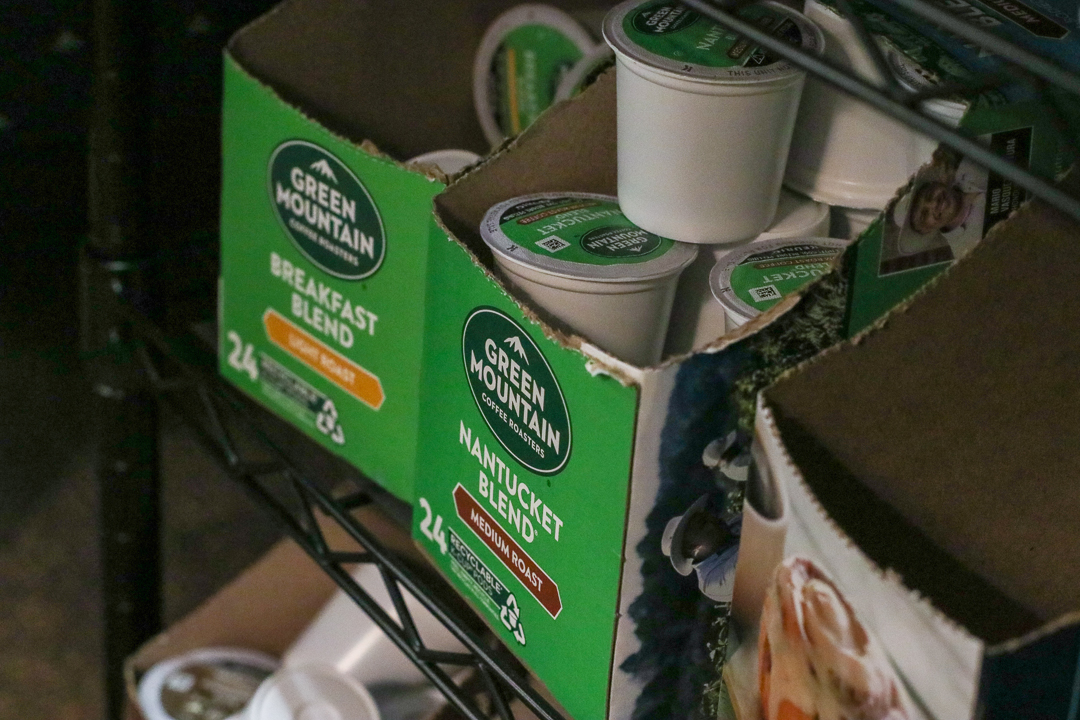 BP: I set up this music system so we can have music. The student workers can [connect with Bluetooth] to it so they can play [music]. We have a coffeemaker that our [department] chair was kind enough to give us the go-ahead to pay for through our budget. It’s open to all of our majors and minors. All of the English majors or minors come in here to get coffee, tea and hot chocolate. We love our lamps — you can see it adds to the ambiance. We try not to use the fluorescent lights; we try to keep it kind of moody. We’ve got comfy chairs here for the students. I turned this giant wooden cabinet over here into a lending library. Students can come and take a book and give a book. It’s open all the time; students can walk in and do that. I really tried to make sure everything was student-focused.