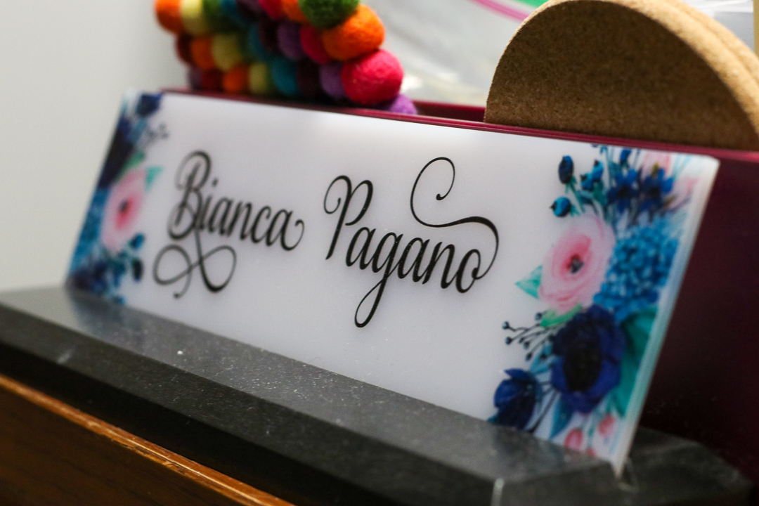 BIANCA PAGANO: My name is Bianca Pagano. I am titled the administrative specialist of the English department. It’s a fun title. It’s kind of long, but basically I do all of the administrative work for the chair [of the department]. [I] just keep English moving relatively smoothly most of the time.